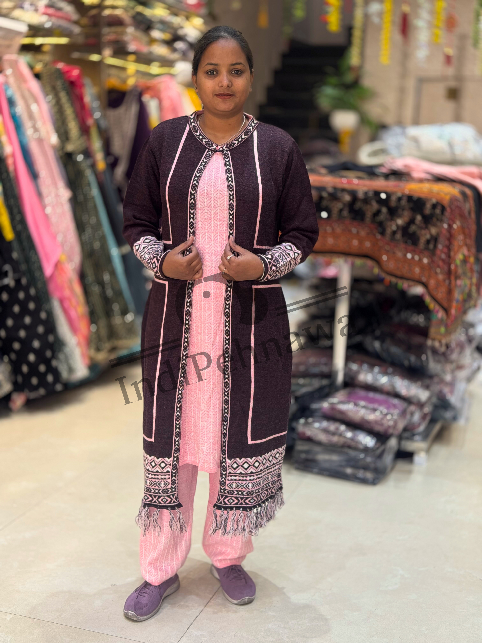 Stay warm and stylish this winter with our 3PC Woolen Set Collection. Featuring a warm and flexible inner layer, this set is designed to keep you cozy and comfortable in cold weather. With a stylish shrug and designer sleeves, this modern essential is perfect for any occasion. Available in sizes up to XXL, this woolen set is a must-have for your winter wardrobe.