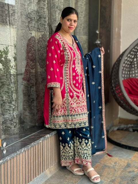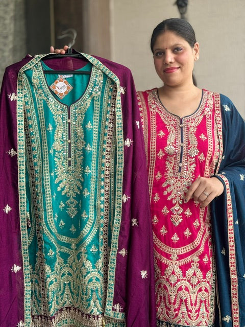 Get ready to be the center of attention at any wedding with our Pakistani article for sizes XXL and XXXL. Immerse yourself in luxury with a heavy chinon suit featuring original mirror work. The top length is 40 inches and the bottom length is 41 inches, making it a perfect fit for any occasion.