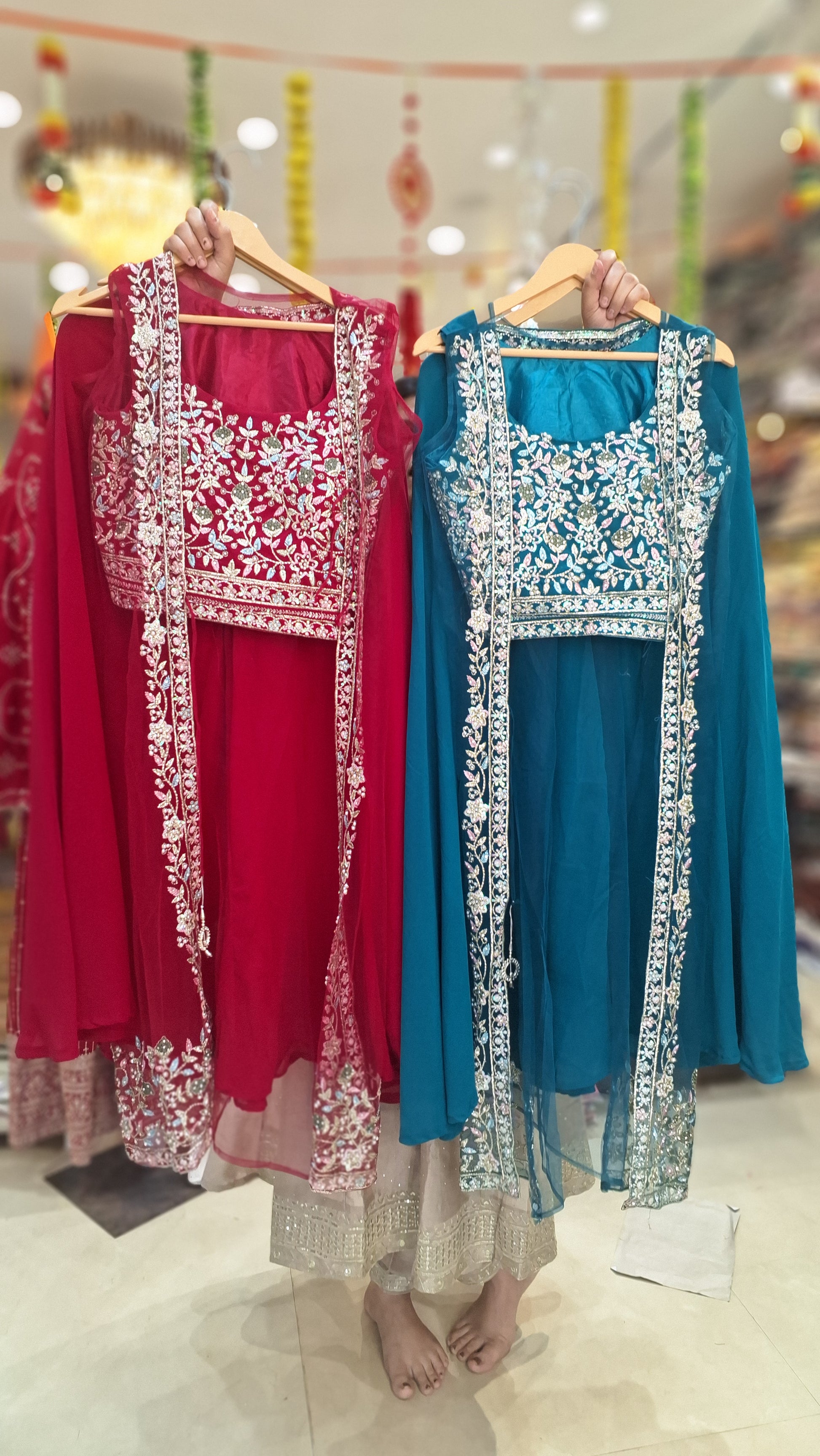 WEDING WEAR PURE GEORGET SHORT TOP WITH JAKET DHOTI SKIRT DRESS