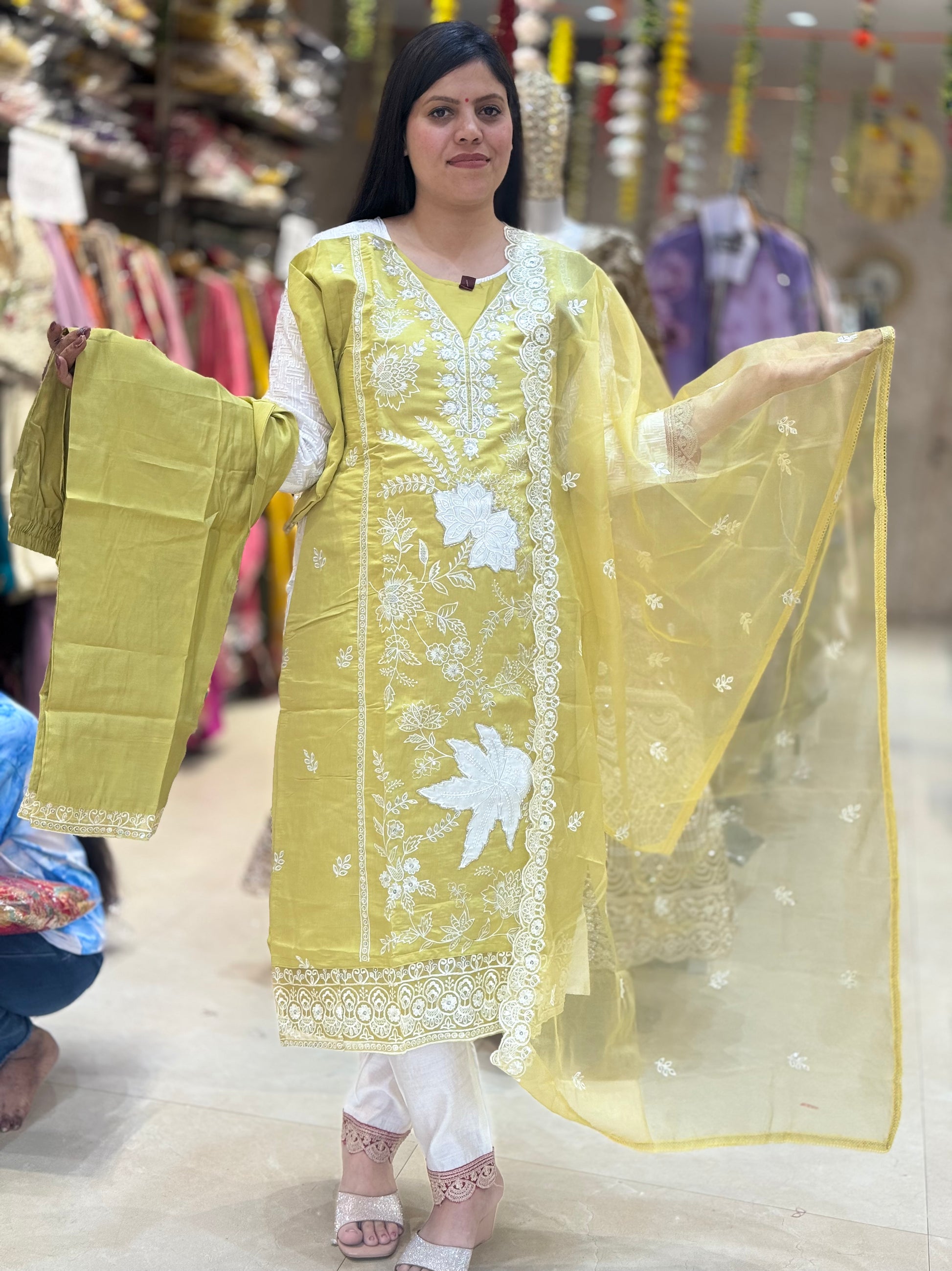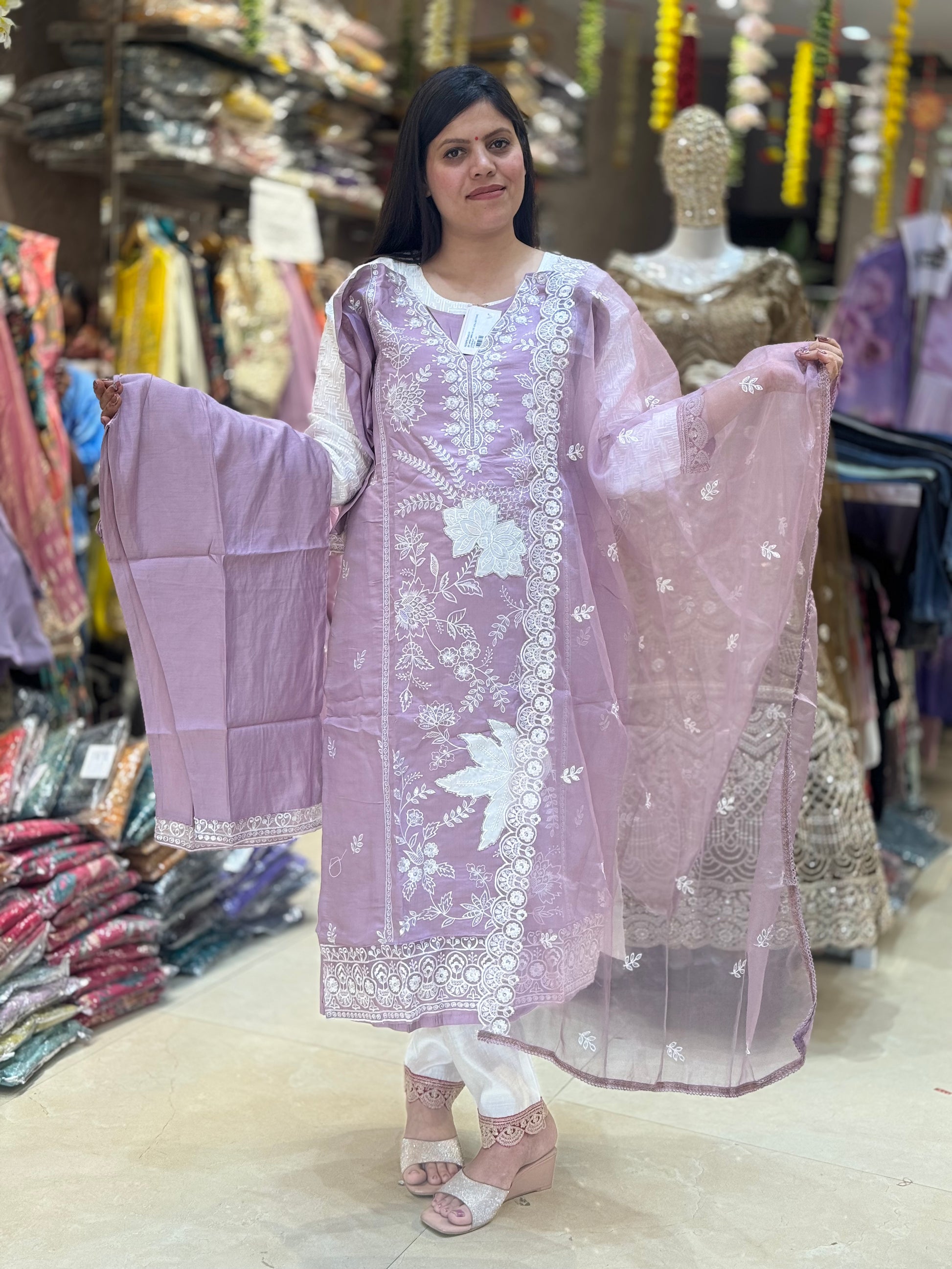 WHITE THREAD WOTK THREE PEACE SET IN ROMAN SILK